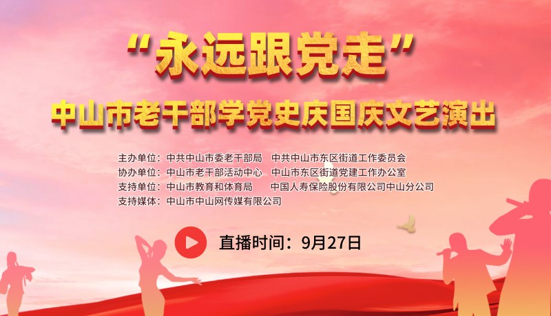 為深入學(xué)習(xí)貫徹習(xí)近平總書記“七一”重要講話精神,深化黨史學(xué)習(xí)教育成果,慶祝中華人民共和國(guó)成立72周年,展示新時(shí)代老干部的精神風(fēng)貌。市委老干部局和東區(qū)街道黨工委聯(lián)合主辦的“永遠(yuǎn)跟黨走”中山市老干部學(xué)黨史慶國(guó)慶文藝演出于9月27日舉行,中山網(wǎng)將全程直播,敬請(qǐng)關(guān)注。