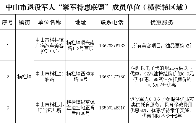 為貫徹落實(shí)習(xí)近平總書記關(guān)于退役軍人工作重要論述精神,加強(qiáng)退役軍人保障工作,我市決定組建中山市“崇軍特惠聯(lián)盟”。橫欄鎮(zhèn)迅速行動(dòng),以“讓退役軍人得實(shí)惠,讓軍人職業(yè)受尊崇”為宗旨,秉持“自愿參與、志愿服務(wù)、優(yōu)質(zhì)規(guī)范、合作共贏”原則,分批次招募聯(lián)盟成員單位,為廣大退役軍人提供價(jià)格優(yōu)惠產(chǎn)品、優(yōu)先優(yōu)待服務(wù)。12月2日,橫欄鎮(zhèn)首批3家“中山市退役軍人崇軍特惠聯(lián)盟”商家正式掛牌。 橫欄鎮(zhèn)副鎮(zhèn)長(zhǎng)程輝、鎮(zhèn)公共服務(wù)辦和鎮(zhèn)退役軍人服務(wù)中心等負(fù)責(zé)人分別到橫欄鎮(zhèn)廣滿汽車美容護(hù)理中心、橫欄加油站、橫欄小叮當(dāng)托兒所進(jìn)行授牌。 據(jù)橫欄鎮(zhèn)退役軍人服務(wù)中心負(fù)責(zé)人介紹,凡持有退役證或優(yōu)待證等有效證件的退役軍人,可到目前市內(nèi)102個(gè)“崇軍特惠聯(lián)盟”成員單位享受優(yōu)惠商品和服務(wù)。同時(shí),橫欄鎮(zhèn)將繼續(xù)探索擁軍優(yōu)撫新模式,吸引更多的企業(yè)、商家加入“崇軍特惠聯(lián)盟”,為退役軍人提供更多更好的服務(wù),增強(qiáng)軍人榮譽(yù)感、自豪感,努力營(yíng)造崇軍的良好社會(huì)氛圍,切實(shí)為退役軍人辦實(shí)事、辦好事、解難事,致敬“最可愛的人”。