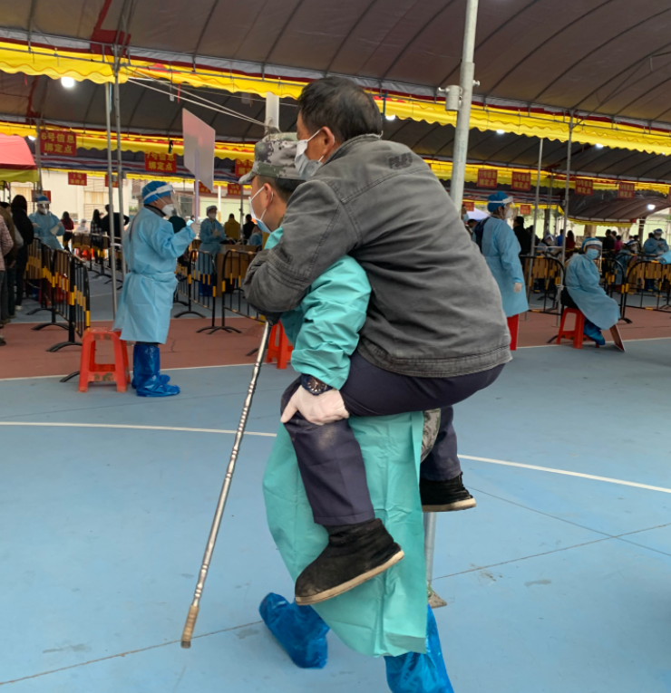 在小欖鎮(zhèn)聯(lián)豐社區(qū)核酸檢測采樣現(xiàn)場,退役軍人吳鴻文背起一位行動不便的老人前往核酸采樣工作臺,采樣結(jié)束后,將老人送出場外。臨走的時候老人連聲向他道謝。 此外,民眾街道退役軍人服務中心動員紅旗志愿服務隊退役軍人志愿者分別前往該街道18個免費便民核酸采樣點,助力街道開展核酸檢測工作。 |
