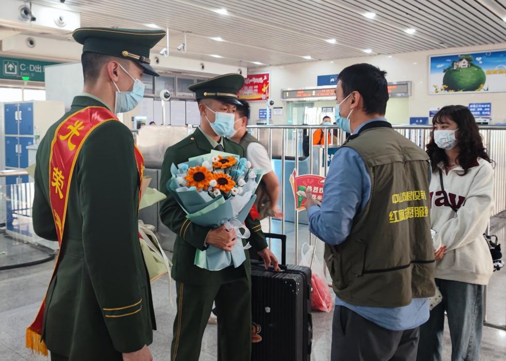 3月1日,中山市坦洲鎮(zhèn)退役軍人服務(wù)中心工作人員會(huì)同退役士兵家屬前往珠海明珠站迎接中山市2023年首批春季退役士兵平安返鄉(xiāng)。在車站出口,工作人員為退役士兵獻(xiàn)上鮮花,退役士兵與家人深情相擁,“最可愛的人”返鄉(xiāng)第一時(shí)間就感受到了來自家鄉(xiāng)及親人的貼心服務(wù)和溫暖。