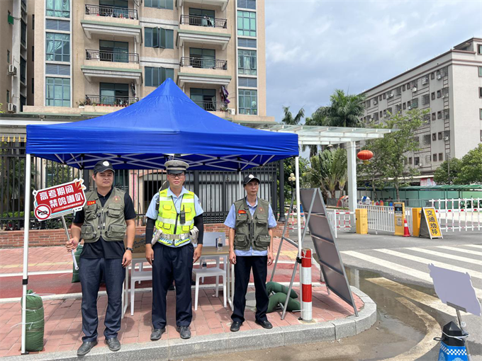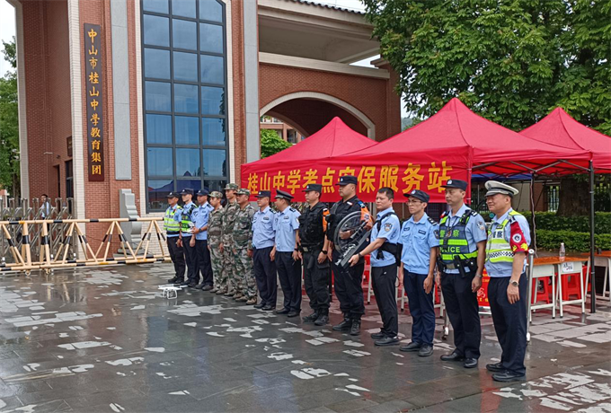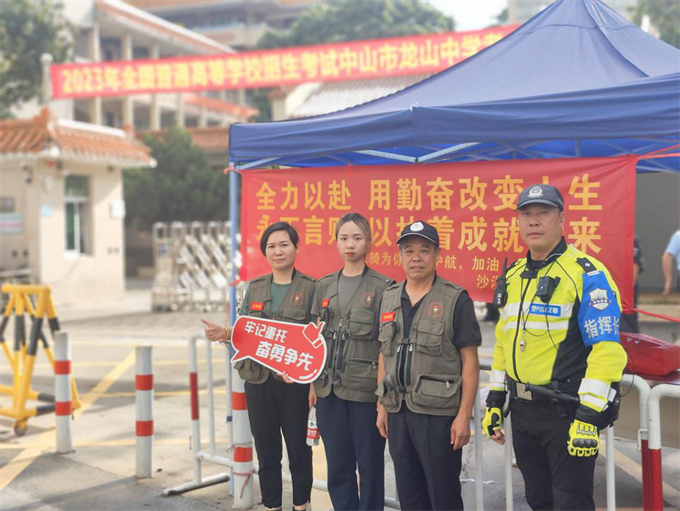 三鄉(xiāng)鎮(zhèn)退役軍人志愿者和民兵在桂山中學(xué)考場提供安保服務(wù)。