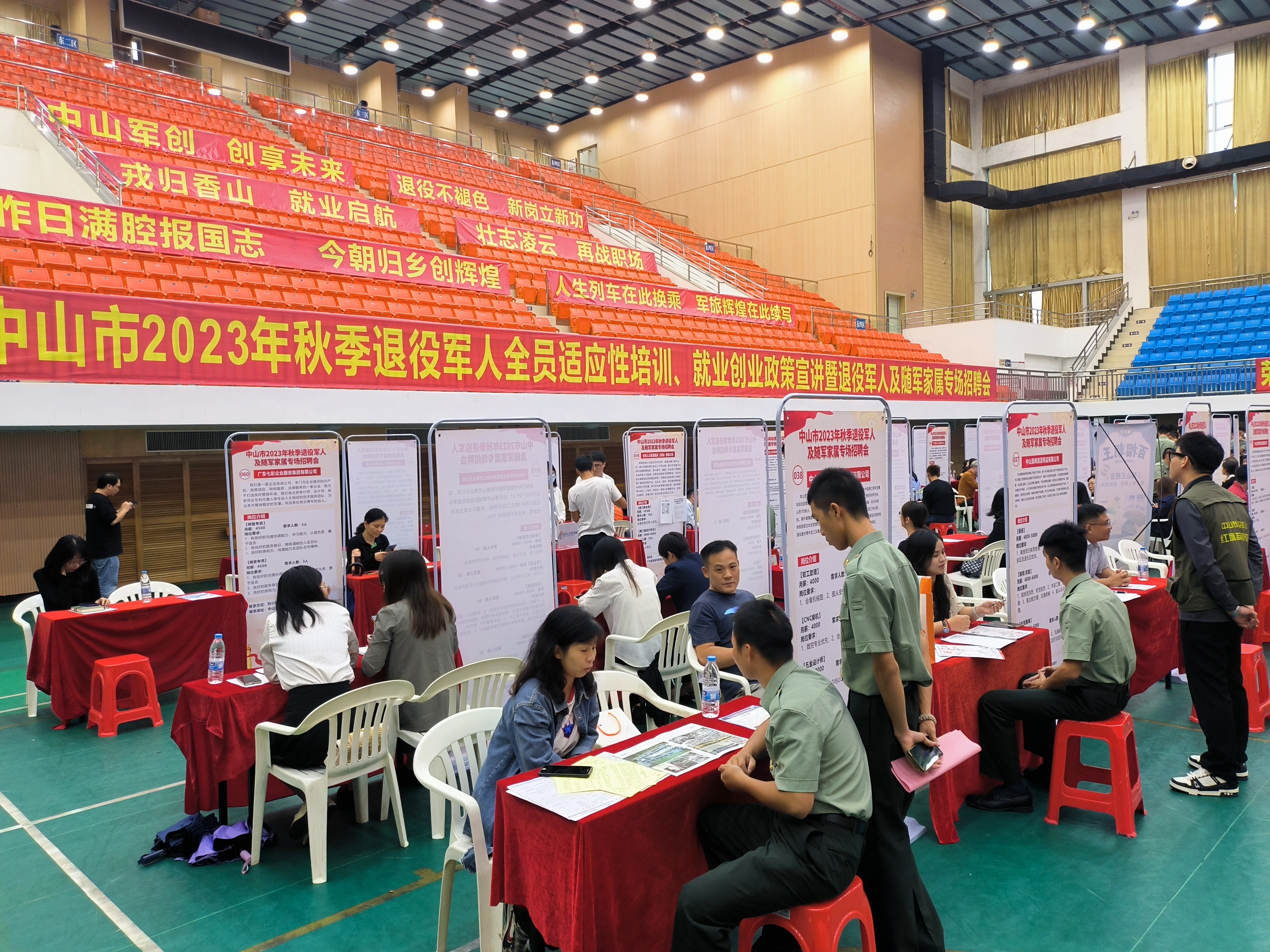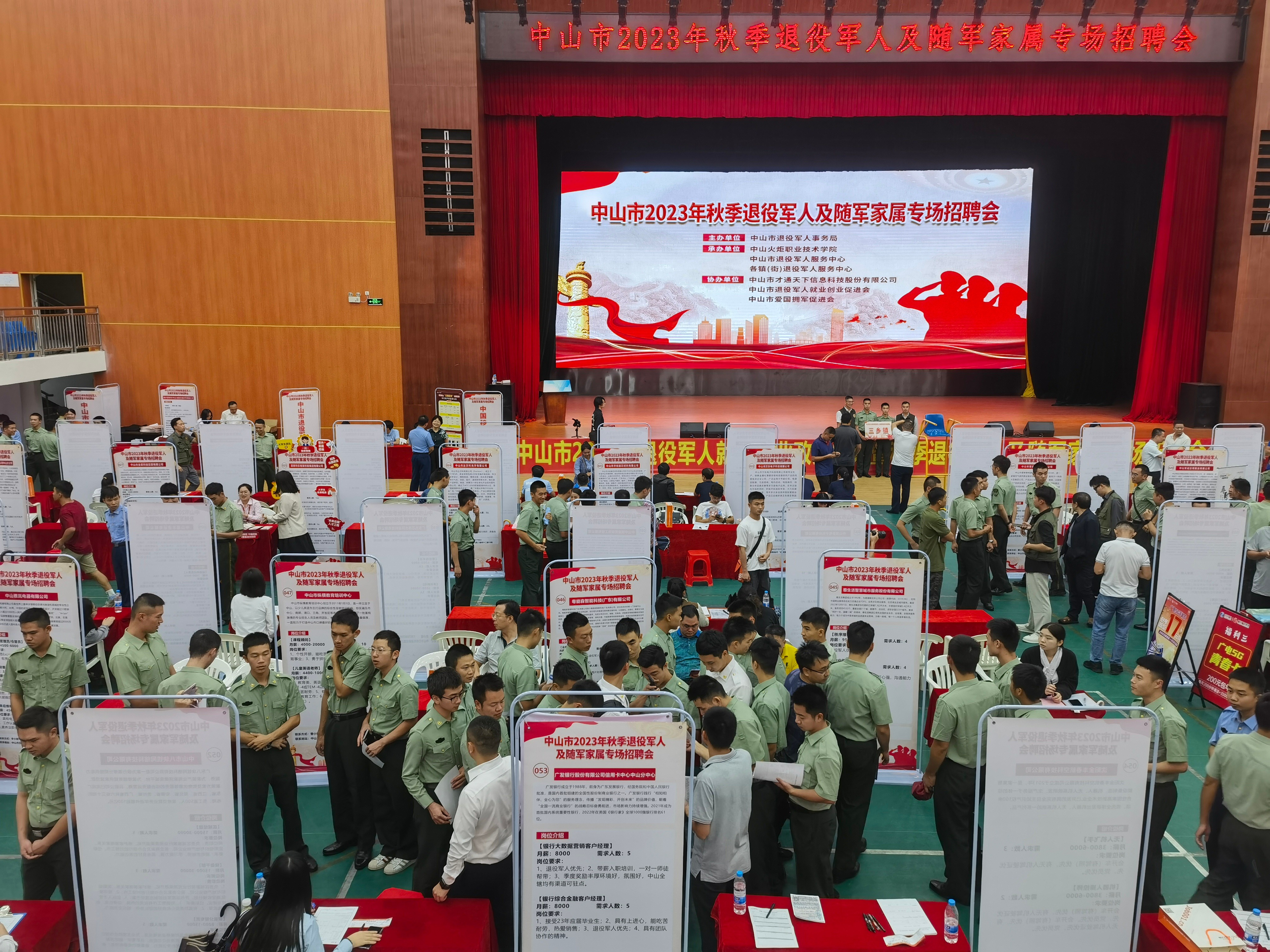 中山市2023年秋季退役軍人及隨軍家屬專場招聘會現(xiàn)場。(市退役軍人事務局供圖) 為深入開展“我為群眾辦實事”實踐活動,推動主題教育走深走實、見行見效,10月20日下午,中山市2023年秋季退役軍人及隨軍家屬專場招聘會在中山火炬職業(yè)技術學院體育館成功舉辦。專場招聘會由中山市退役軍人事務局主辦,中山火炬職業(yè)技術學院、中山市退役軍人服務中心、各鎮(zhèn)(街)退役軍人服務中心承辦,中山市才通天下信息科技股份有限公司、中山市退役軍人就業(yè)創(chuàng)業(yè)促進會、中山市愛國擁軍促進會協(xié)辦。