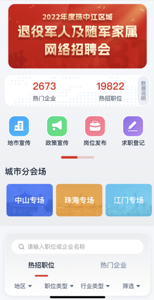 2022年度珠中江區(qū)域退役軍人及隨軍家屬網(wǎng)絡招聘會頁面。 主頁分設城市宣傳專區(qū)、政策宣傳專區(qū)、崗位發(fā)布入口、求職登記入口、求職訂閱服務、在線測評共六大功能板塊。 招聘會設置退役軍人就業(yè)指導員,根據(jù)就業(yè)及企業(yè)需求調研結果,對有求職意向的退役軍人和隨軍家屬提供精準匹配及推送、政策咨詢、簡歷指導、崗位推薦等就業(yè)指導服務。 一、求職登記流程 1、求職登記 手機掃碼進入【2022年度珠中江區(qū)域退役軍人及隨軍家屬網(wǎng)絡招聘會】,電腦端可通過文章左下方原文鏈接進入專場。點擊【求職登記】即可登記,登記成功后,企業(yè)HR可以通過平臺與求職者聯(lián)系溝通。