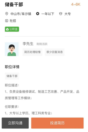 ▲求職者注冊流程 3、投遞簡歷 完善注冊信息后,即可跳轉至【2022年度珠中江區(qū)域退役軍人及隨軍家屬網(wǎng)絡招聘會】,點擊職位名稱可進入相應職位詳情頁,點擊企業(yè)可進入企業(yè)詳情頁,可查看企業(yè)發(fā)布的在線職位。 點擊職位詳情頁左下方【立即溝通】可和HR進行溝通,點擊右下方【投遞簡歷】即可完成投遞。