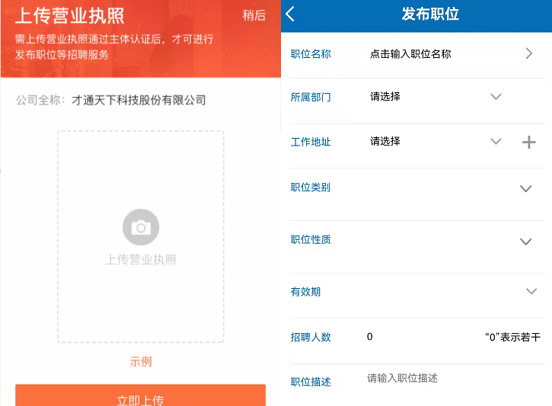 ▲企業(yè)注冊流程 2、發(fā)布職位 完善注冊信息后,即可進入到【企業(yè)會員中心管理后臺】,發(fā)布職位前【上傳營業(yè)執(zhí)照】,【通過審核后】即可發(fā)布職位,企業(yè)發(fā)布的符合條件的崗位將同步更新至【2022年度珠中江區(qū)域退役軍人及隨軍家屬網(wǎng)絡招聘會】