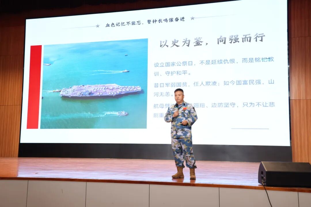 活動邀請中山港口鎮(zhèn)人民武裝部副部長賀洪彪以《銘記歷史守海疆 青春立志報(bào)家國》為題開展專題講座,帶領(lǐng)師生重溫南京大屠殺那段山河破碎的屈辱歷史,闡釋國家公祭日的設(shè)立意義,讓師生深刻理解“銘記歷史、勿忘國恥”的意義。現(xiàn)場莊嚴(yán)肅穆,全體師生為南京大屠殺死難同胞默哀,用無聲的敬意寄托對逝者的哀思。 會上,賀洪彪結(jié)合自身十五載南沙守礁經(jīng)歷,講述“以礁為家、以苦為榮”的崢嶸歲月,用軍人的忠誠與信仰,詮釋新時(shí)代國防衛(wèi)士守護(hù)家國的責(zé)任擔(dān)當(dāng),讓師生們真切感受到和平生活的來之不易。