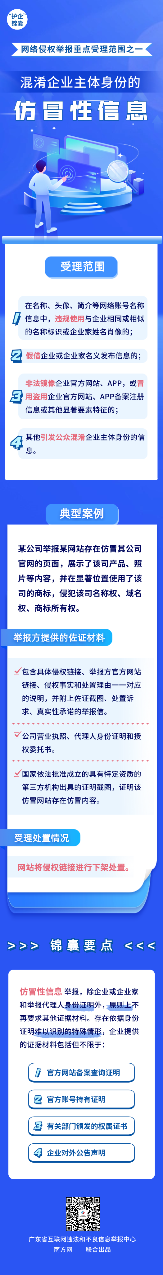 為有效助力企業(yè)維護(hù)自身網(wǎng)絡(luò)合法權(quán)益,廣東省互聯(lián)網(wǎng)違法和不良信息舉報(bào)中心精心準(zhǔn)備了“護(hù)企”錦囊,結(jié)合案例帶大家了解涉企網(wǎng)絡(luò)侵權(quán)信息的重點(diǎn)受理范圍,今天推出重點(diǎn)受理范圍之一——混淆企業(yè)主體身份的仿冒性信息。