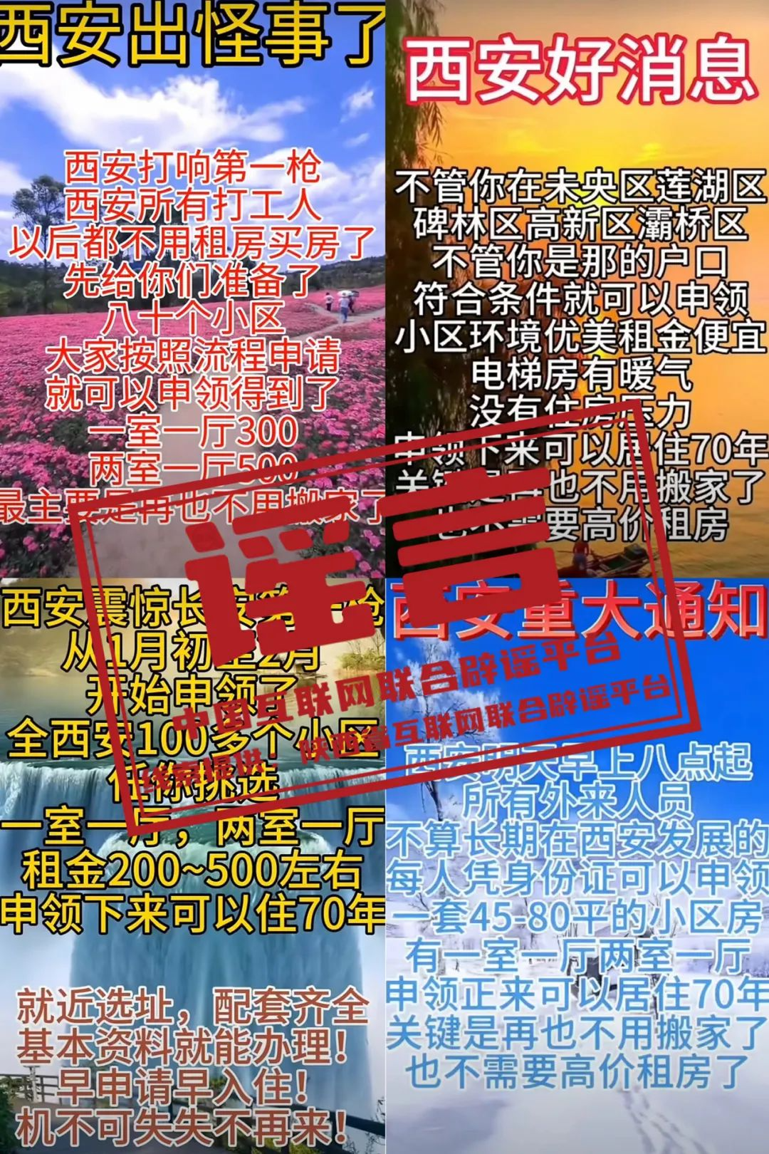 真相:近期,自媒體平臺(tái)上出現(xiàn)以“西安緊急通知”“西安出怪事了”等夸大性、煽動(dòng)性話語為標(biāo)題,散播“憑身份證就可申領(lǐng)”“全西安市100多個(gè)小區(qū)任你挑選”“一次申領(lǐng)可以一直居住”等模糊性、誘導(dǎo)性內(nèi)容的信息。對(duì)此,西安市保障性住房管理中心發(fā)布聲明回應(yīng)稱,以上內(nèi)容均為不實(shí)信息,是對(duì)西安市公租房政策的歪曲理解和斷章取義。該聲明還特別提醒網(wǎng)民:有關(guān)西安市保障房政策、房源等相關(guān)信息,均以西安市住建局官方媒體發(fā)布的信息為準(zhǔn)。(來源:陜西省互聯(lián)網(wǎng)聯(lián)合辟謠平臺(tái)、“西安住建”微信公眾號(hào))