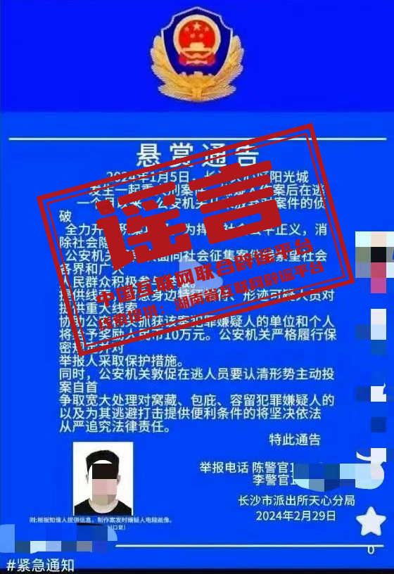 謠 言 湖南省長沙市天心區(qū)發(fā)生重大刑案,警方發(fā)布懸賞通告?