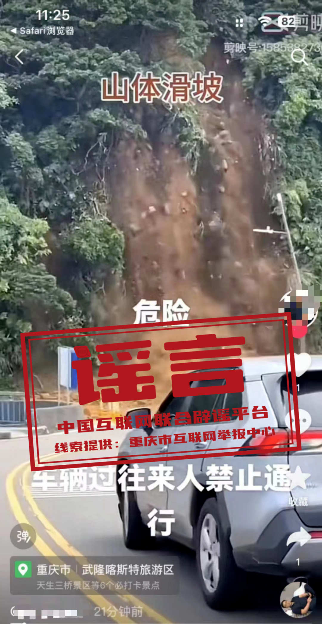 真相:近日,有網(wǎng)民發(fā)布了一則“山體滑坡危險(xiǎn),過往車輛行人禁止通行”的視頻,視頻定位標(biāo)注為“重慶市武隆喀斯特旅游區(qū)”。經(jīng)重慶市武隆區(qū)多部門核實(shí),該區(qū)近期未發(fā)生大面積山體滑坡事件。網(wǎng)傳視頻實(shí)為2024年6月3日臺(tái)灣省基隆市中正區(qū)潮境公園入口發(fā)生的大規(guī)模山體滑坡事件,而視頻中所標(biāo)注的定位信息系網(wǎng)民發(fā)布視頻的地點(diǎn),而非事件發(fā)生的地點(diǎn)。(來源:“重慶辟謠”微信公眾號(hào)、網(wǎng)信武?。?/span>