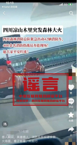 真相:近日,有網(wǎng)民在短視頻平臺上發(fā)布視頻,并配以“四川涼山木里突發(fā)森林大火,四川森林消防總隊緊急出動42輛消防車,400余名消防指戰(zhàn)員奔赴現(xiàn)場”的文字。當(dāng)?shù)鼐W(wǎng)信部門聯(lián)動應(yīng)急管理局進(jìn)行查核,證實(shí)四川涼山木里近日未發(fā)生森林大火。(來源:四川互聯(lián)網(wǎng)舉報辟謠平臺)