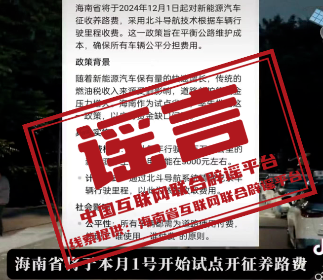 謠 言 海南12月1日起對(duì)新能源汽車征收養(yǎng)路費(fèi)?