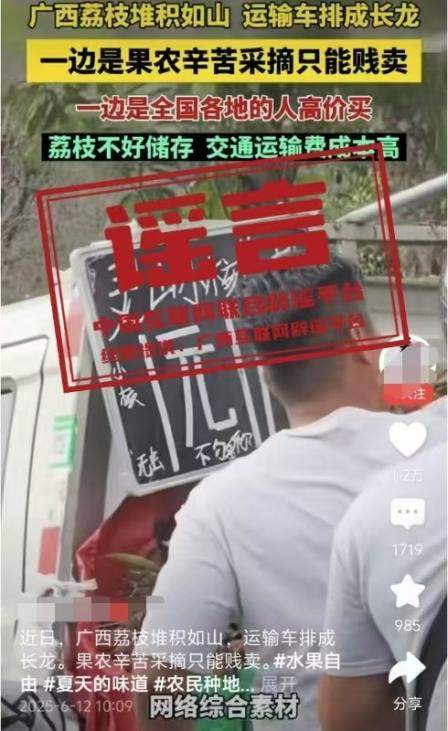 真相:6月12日,網(wǎng)傳“近日廣西荔枝堆積如山,運(yùn)輸車排成長龍。果農(nóng)辛苦采摘只能賤賣”的視頻,畫面顯示荔枝堆積和“靈山荔枝1元”字樣。經(jīng)核查,視頻內(nèi)容并非發(fā)生在靈山縣。目前,靈山荔枝“妃子笑”等中熟品種逐漸批量上市,大規(guī)模上市時(shí)間為6月20日左右,當(dāng)前荔枝產(chǎn)銷有序開展,并未發(fā)現(xiàn)個(gè)別媒體報(bào)道的“荔枝滯銷賤賣”“采摘堆積成山”“運(yùn)輸車排成長龍”的情況,也沒有發(fā)現(xiàn)價(jià)格低到1元的荔枝出售。(來源:“廣西互聯(lián)網(wǎng)違法和不良信息舉報(bào)”微信公眾號)