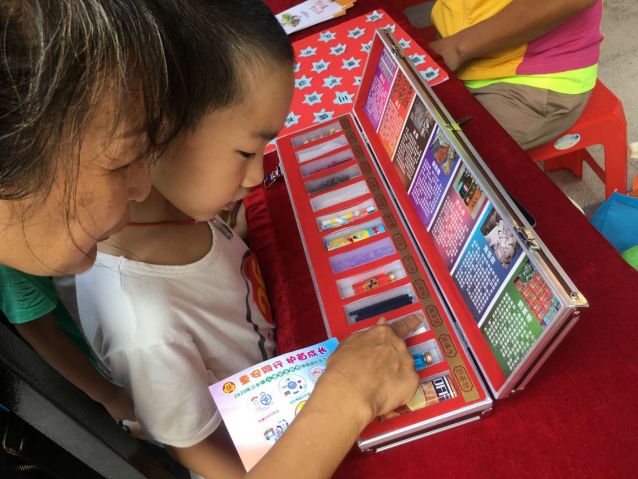 親子家庭在禁毒志愿者的引導下進行禁毒小游戲。