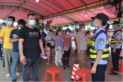 阜沙禁毒一線工作者在核酸檢測現(xiàn)場協(xié)助維持秩序。